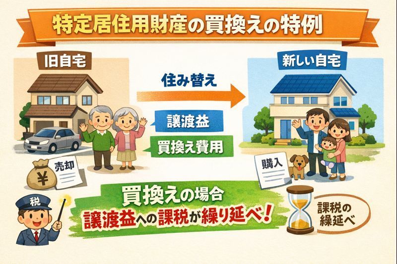 特定居住用財産のマイホームを売却して新たにマイホームを買替える場合に、譲渡所得の課税を将来に繰り延べできる制度です。